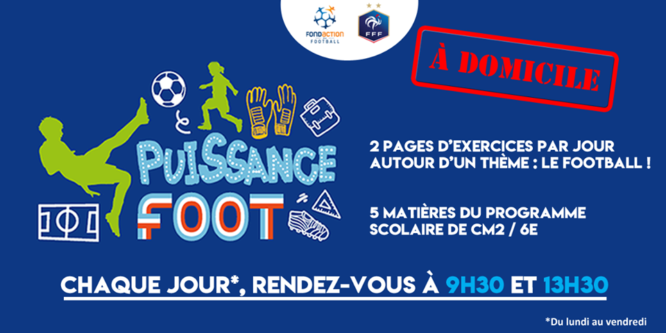 Le Fondaction du Football et la FFF, grâce au programme d’accompagnement scolaire Puissance Foot, proposent, en complément des dispositifs mis en place par les pouvoirs publics, de bénéficier chaque jour d’exercices issus du livret d’activités pour les enfants de 10 à 12 ans (catégorie U11/U12) pendant la période de fermeture des établissements scolaires.