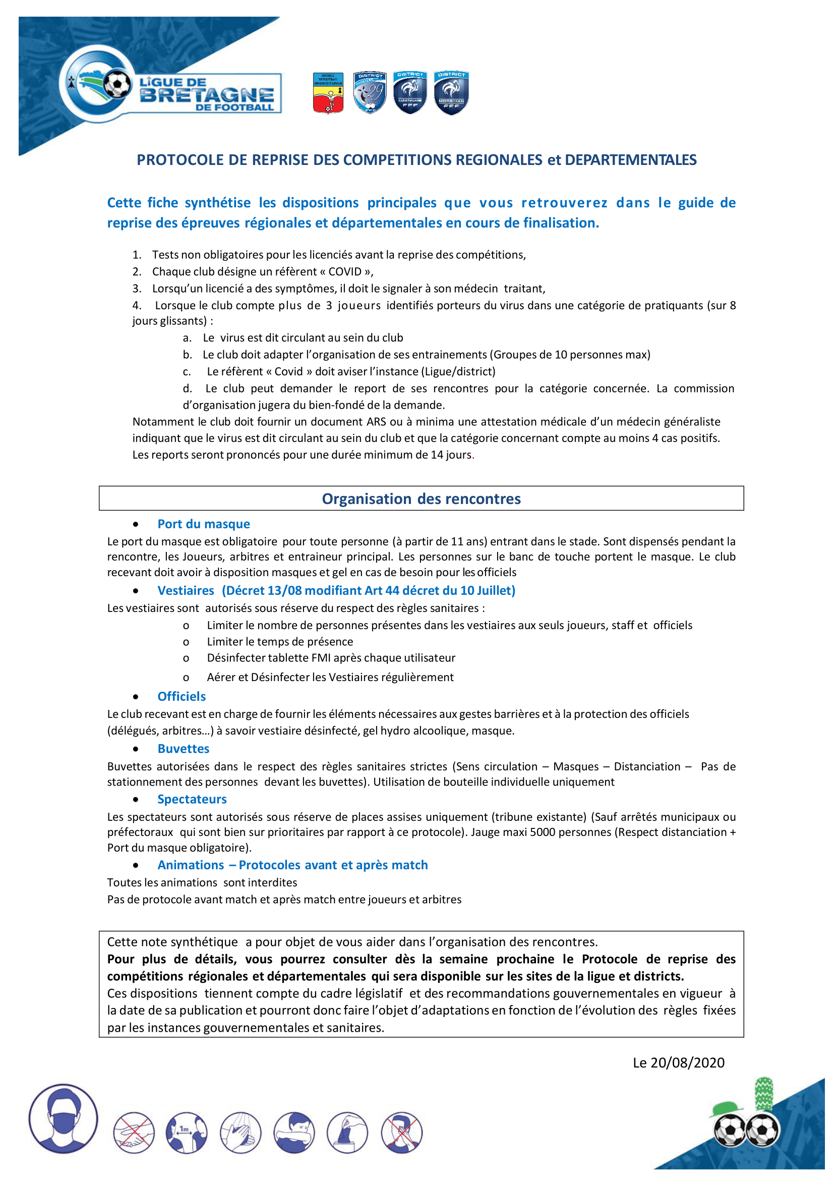 Afin d’aider dans l’organisation des rencontres, la Ligue de Bretagne de Football a réalisé une fiche qui synthétise les dispositions principales à respecter :